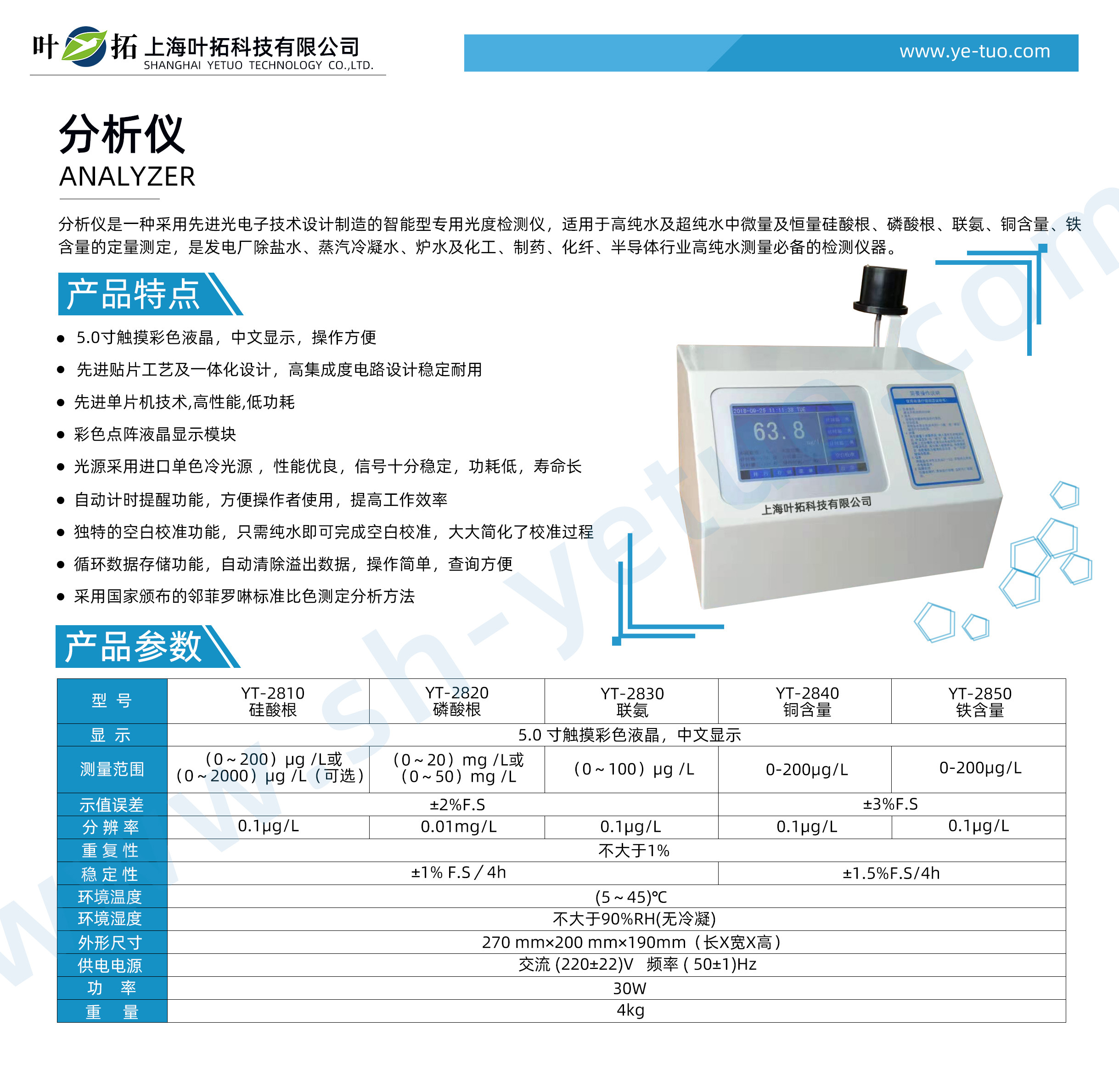 The analyzer is an intelligent specialized photometric detector designed and manufactured using advanced optoelectronic technology. It is suitable for quantitative determination of trace and constant amounts of silicate, phosphate, hydrazine, copper content in high-purity and ultra pure water. It is an essential detection instrument for measuring desalinated water, steam condensate water, furnace water, and high-purity water in the chemical, pharmaceutical, chemical fiber, and semiconductor industries in power plants.