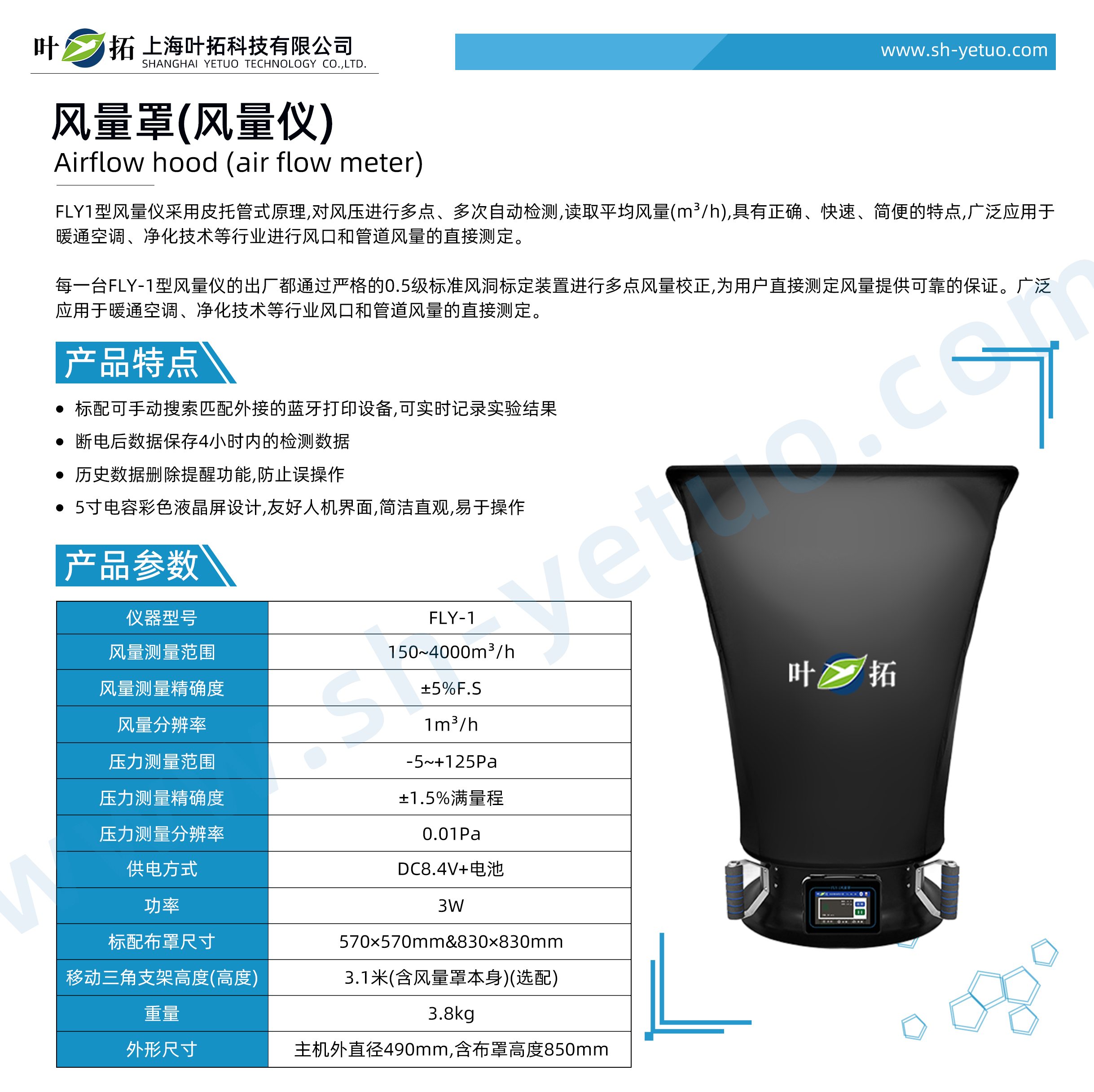 The FLY1 type air volume meter adopts the pitot tube principle to automatically detect air pressure at multiple points and multiple times, and reads the average air volume (m 3/h). It has the characteristics of accuracy, speed, and simplicity, and is widely used in industries such as HVAC and purification technology for direct measurement of air volume in vents and pipelines.