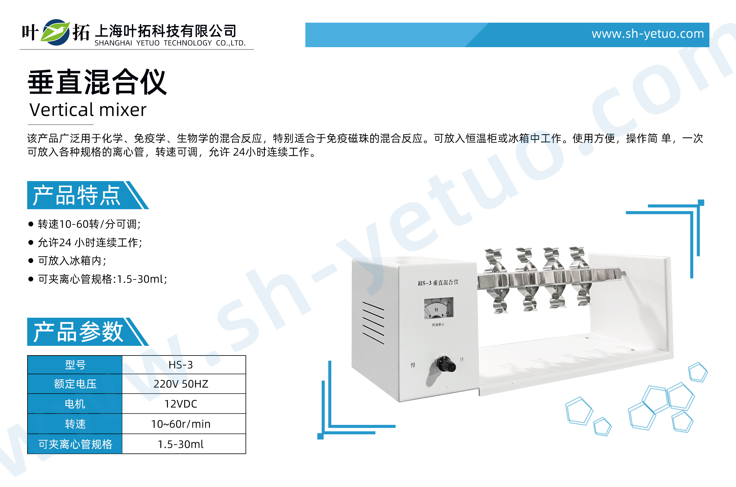 This product is widely used in mixed reactions of chemistry, immunology, and biology, and is particularly suitable for mixed reactions of immunomagnetic beads. Can be placed in a constant temperature cabinet or refrigerator for operation. Easy to use, simple to operate, can fit various specifications of centrifuge tubes at once, adjustable speed, allowing 24-hour continuous operation.