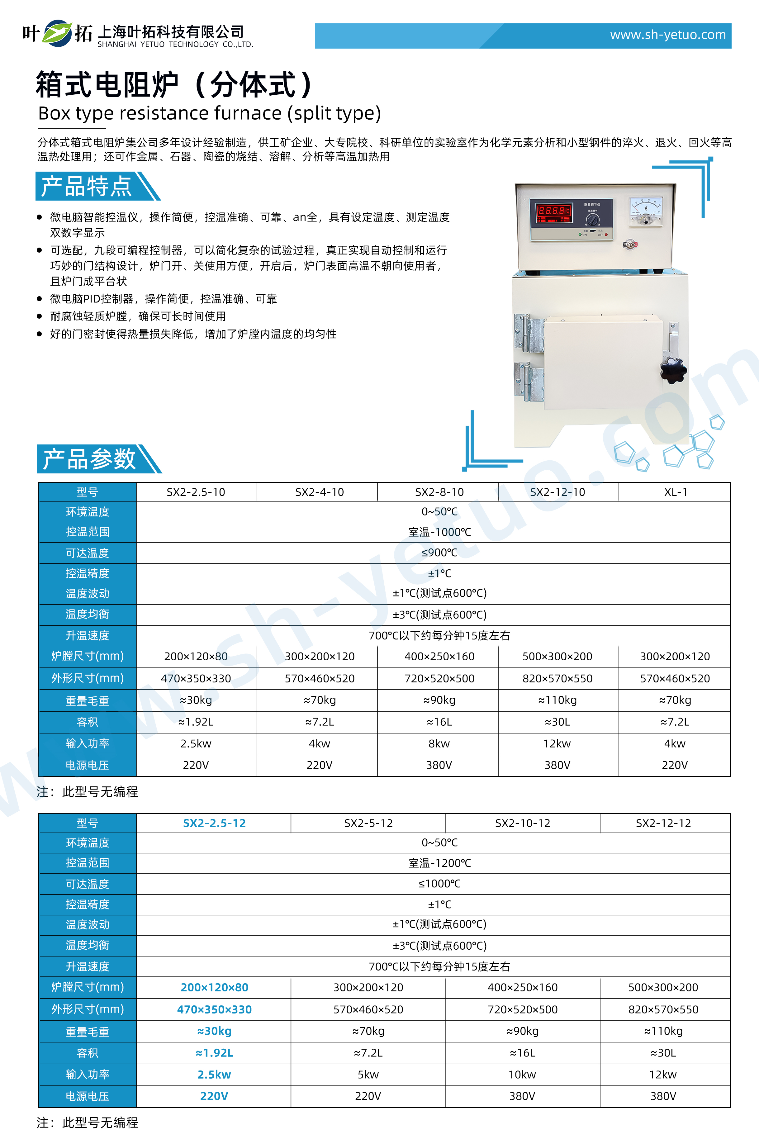 葉拓 SX2-2.5-12 分體式箱式電阻爐詳細(xì)參數(shù)