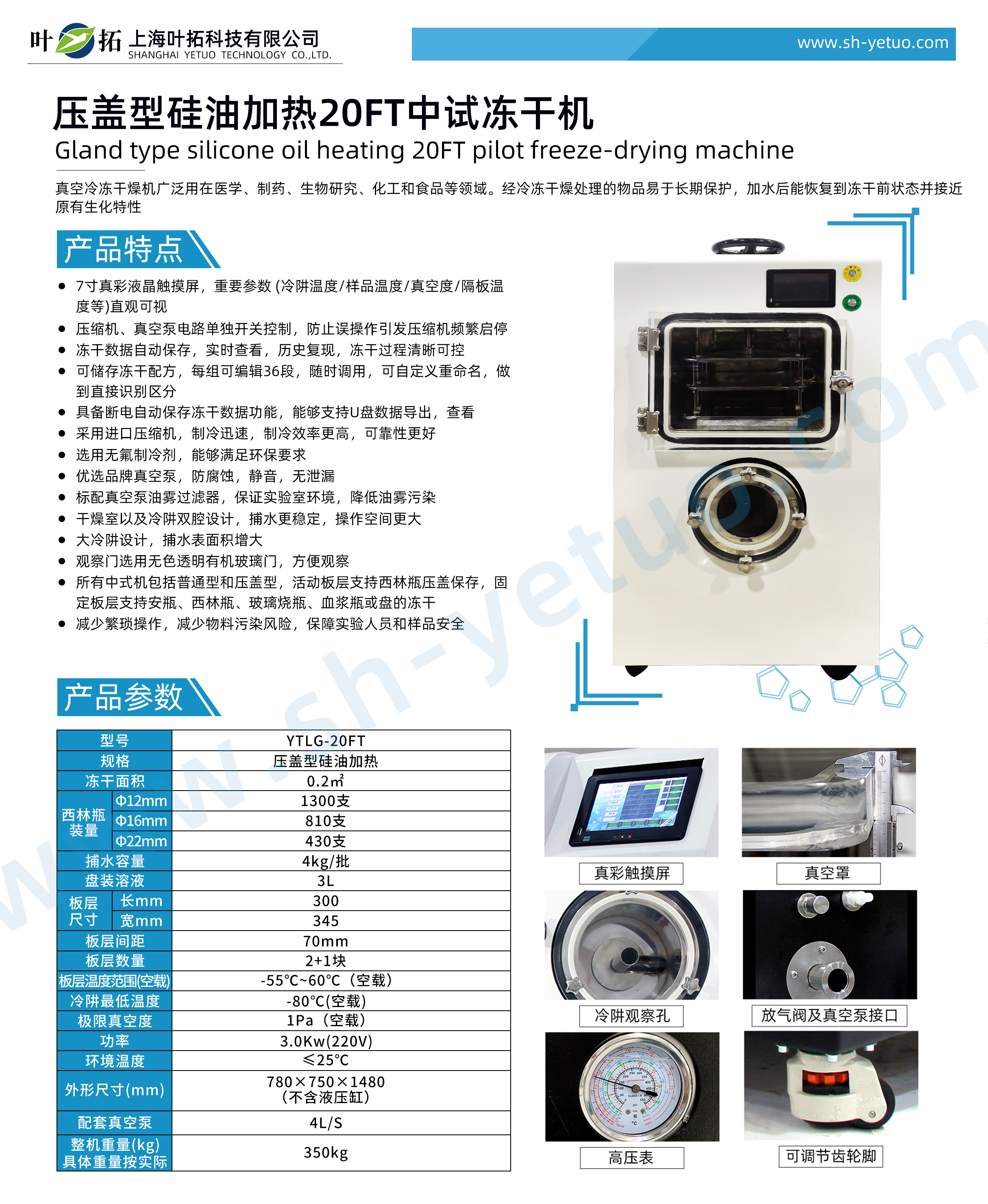 葉拓 YTLG-20FT 壓蓋型0.2平方硅油加熱凍干機詳細參數