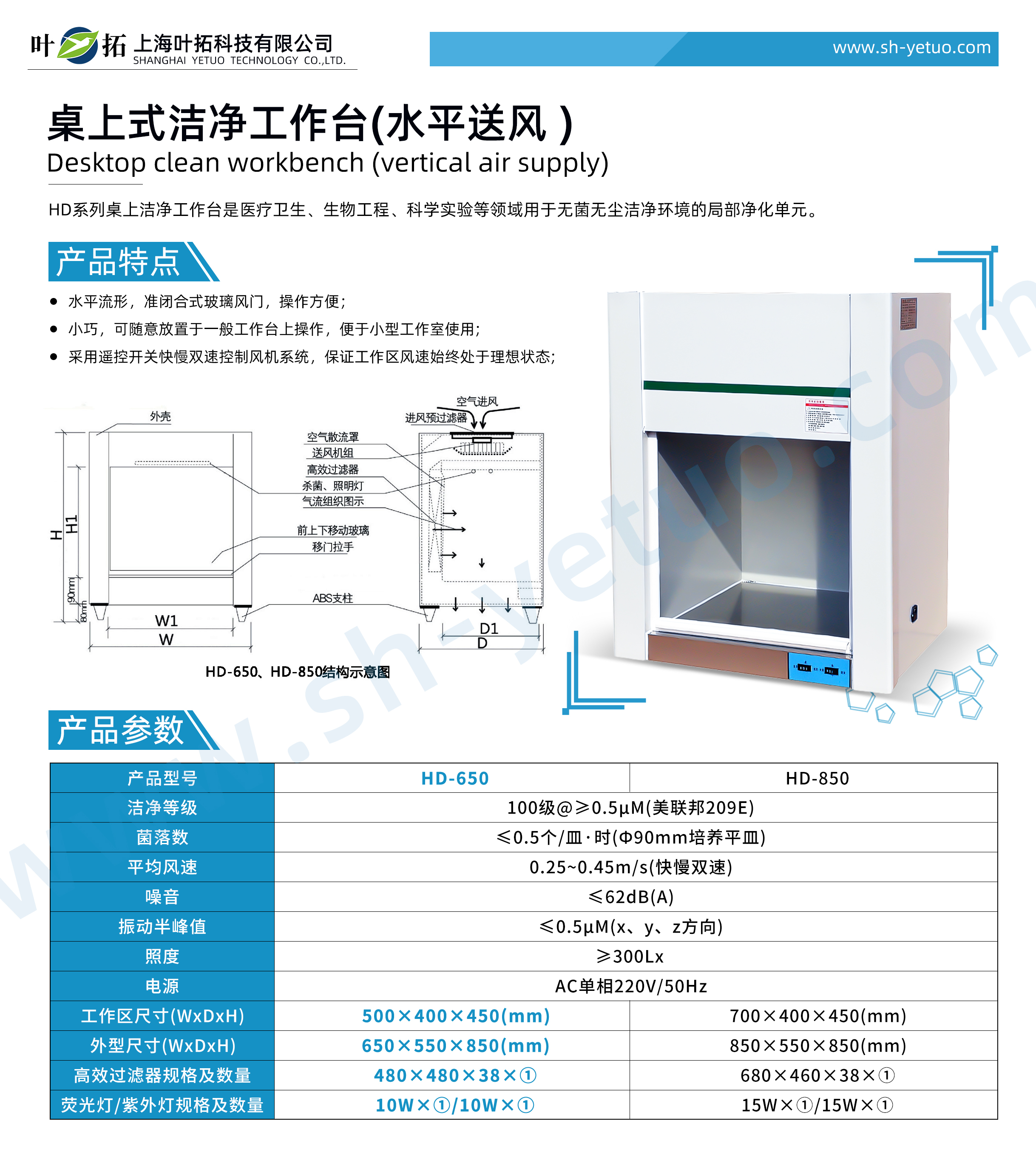 葉拓 HD-650 桌上式潔凈工作臺(水平送風)詳細參數