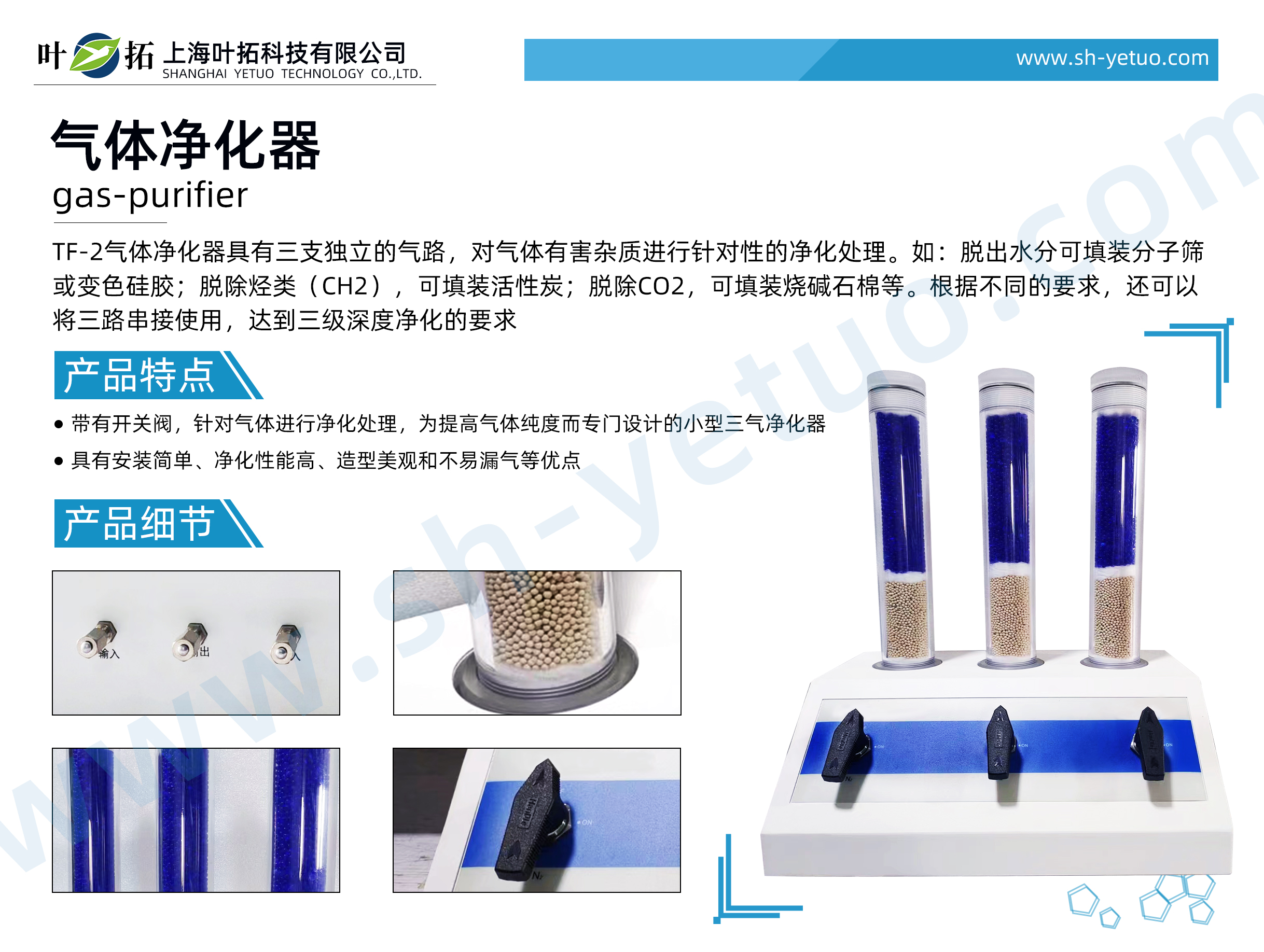 TF-2氣體凈化器具有三支獨立的氣路,對氣體有害雜質進行針對性的凈化處理。如:脫出水分可填裝分子篩或變色硅膠,脫除烴類(CH2),可填裝活性炭,脫除CO2,可填裝燒堿石棉等。根據不同的要求,還可以將三路串接使用,達到三級深度凈化的要求。