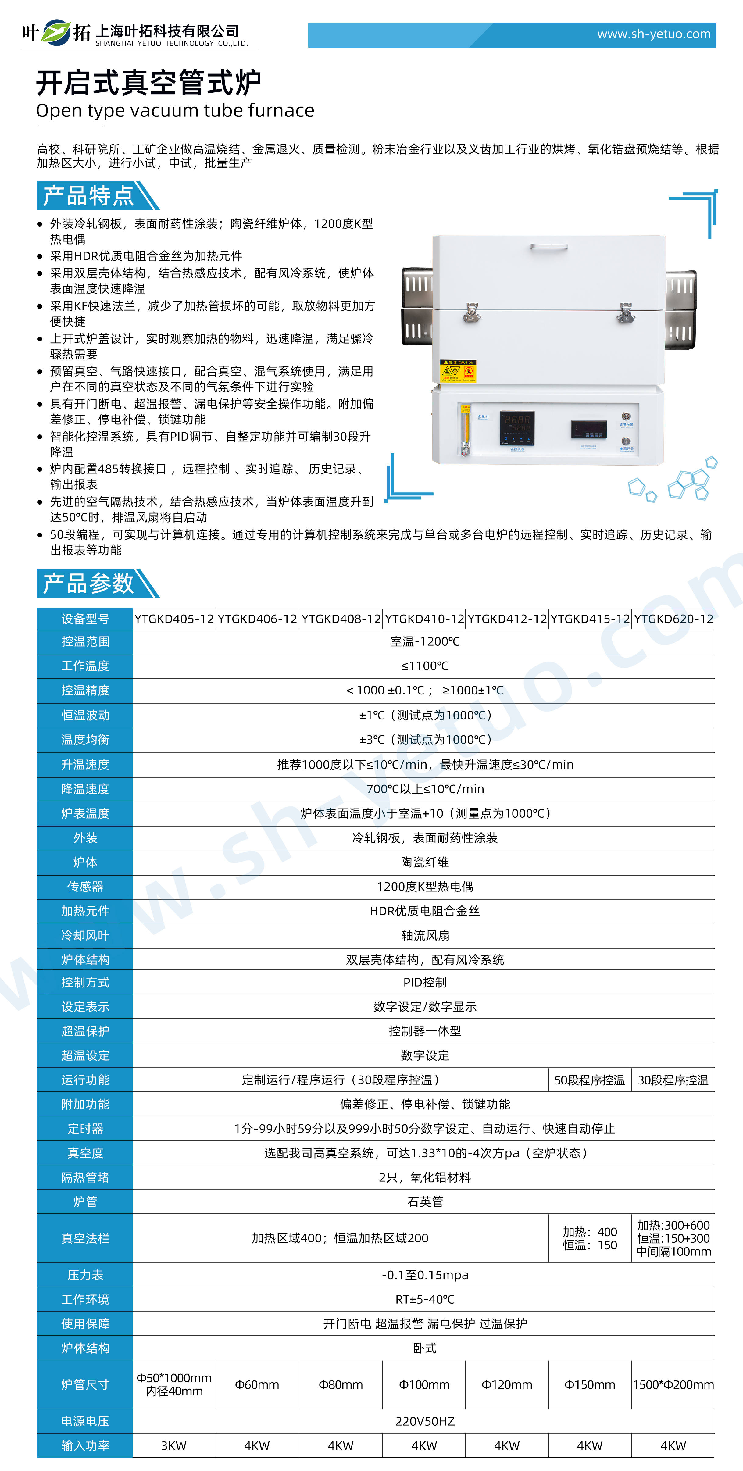 葉拓 YTGKD410-12 開啟式真空管式爐詳細(xì)參數(shù)